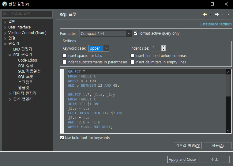 윈도우 - 설정 - 편집기 - SQL 편집기 - SQL 포맷