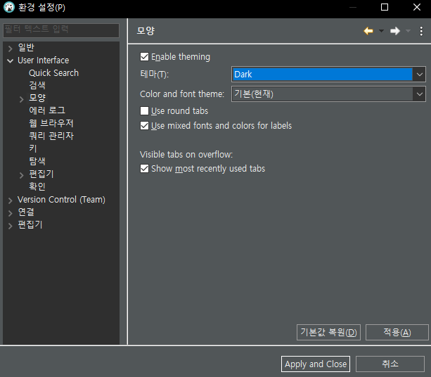 윈도우 - 설정 - User Interface - 모양 - 테마 : Dark 변경