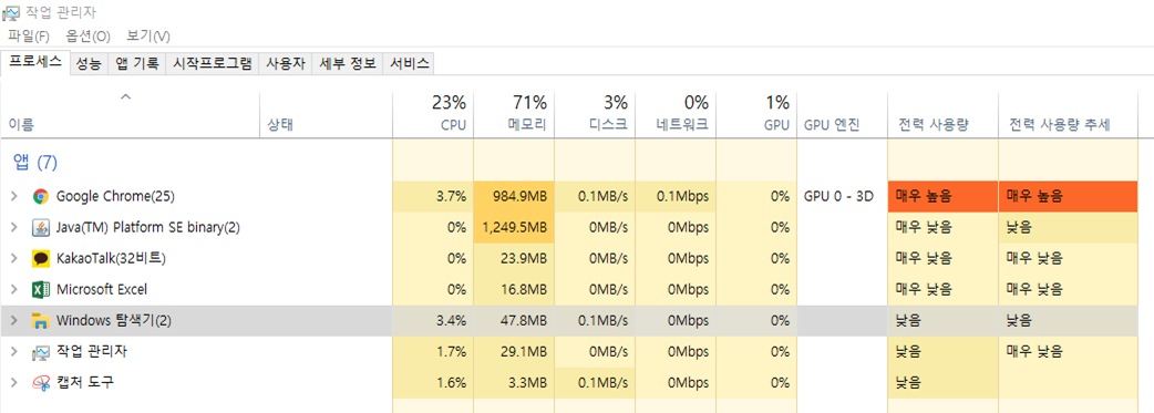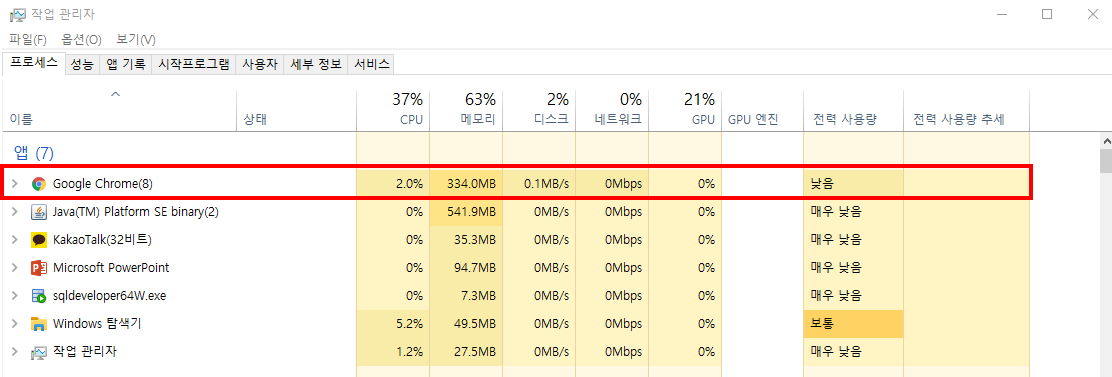 이때 작업관리자 프로세스를 확인해보면 크롬의 적력 사용량이 "매우 높음" 혹은 "높음"으로 나오는 것을 확인할 수 있다.