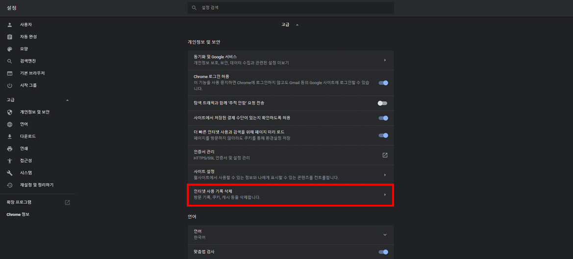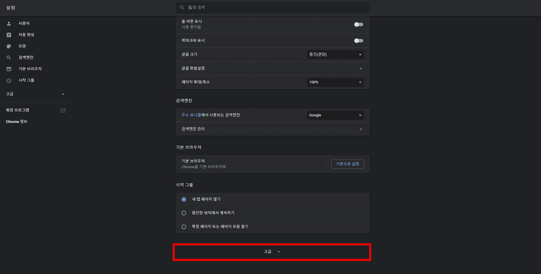 설정페이지의 스크롤을 아래로 내리면 [고급] 탭이 있다.