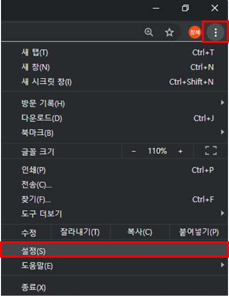 인터넷 창에 [더보기] 혹은 아래 그림과 같은 더보기 아이콘을 클릭하면 설정 페이지로 이동할 수 있다.