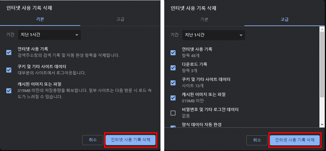 인터넷 사용 기록 팝업창이 뜨는데 이때 삭제할 기록을 체크박스로 선택한 뒤 인터넷 사용 기록 삭제를 클릭하면