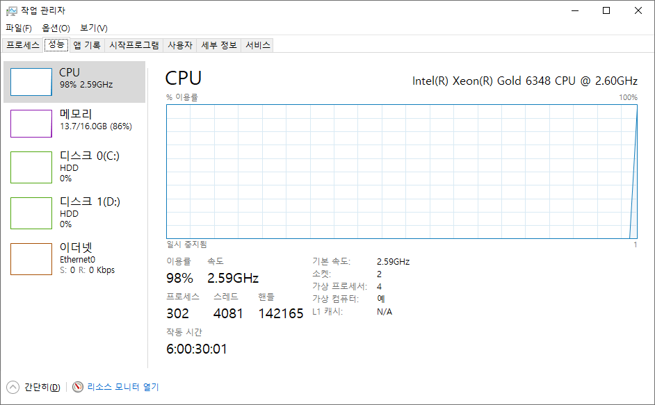 - 작업 관리자 - 성능 - 가상화 사용 설정을 확인한다.