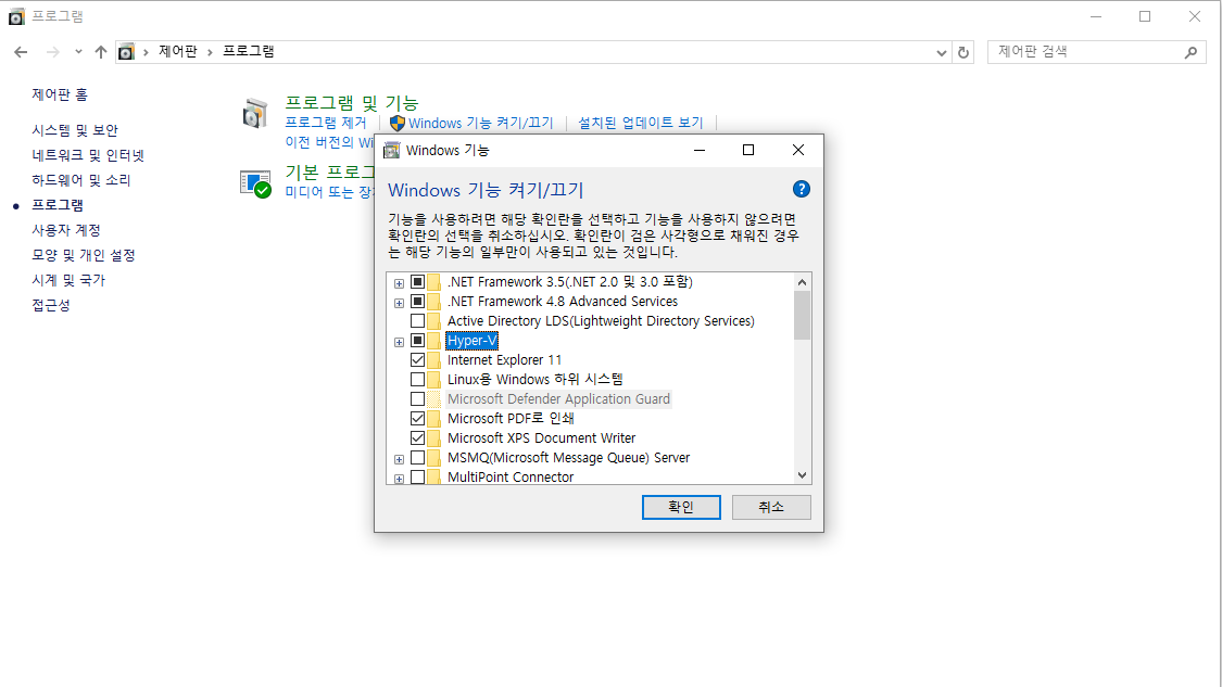 - 제어판 - 프로그램 - 프로그램 및 기능 - Windows 기능 켜기/끄기 - Hyper-V 활성화 후 리부팅