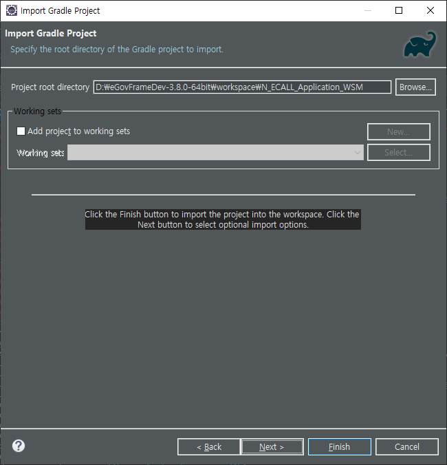 - Project root directory (프로젝트 경로)에 압축 해제한 파일을 넣고 Next .... Finish 를 해준다.