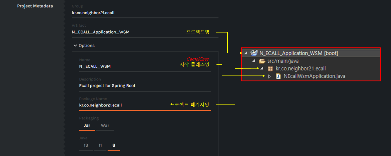 - 옵션명과 그룹등이 어떻게 생성되는지 예시이다. (명칭 맞추겠다고 프로젝트 생성했다 지웠다.. 이거보고 잊지말아야지)