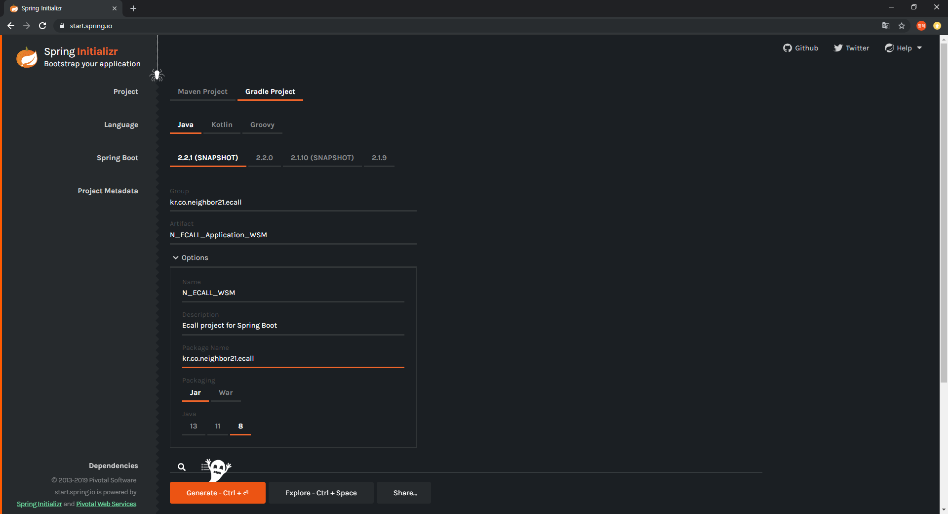 - 스프링 프로젝트를 간단하게 세팅해주는 사이트에 들어가자. (왜 이제 알았나... 이렇게 좋은 것을... ☆★)