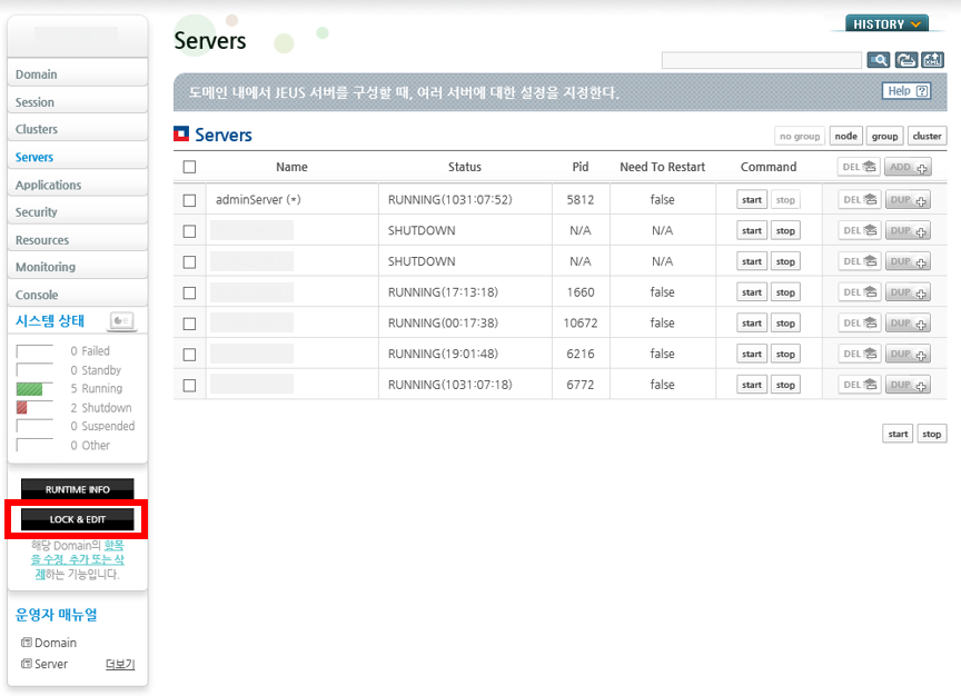 서버를 추가하기 전에 왼쪽 메뉴 하단에 위치한 LOCK & EDIT 버튼을 클릭해서 동적 설정 변경 모드로 전환한다.