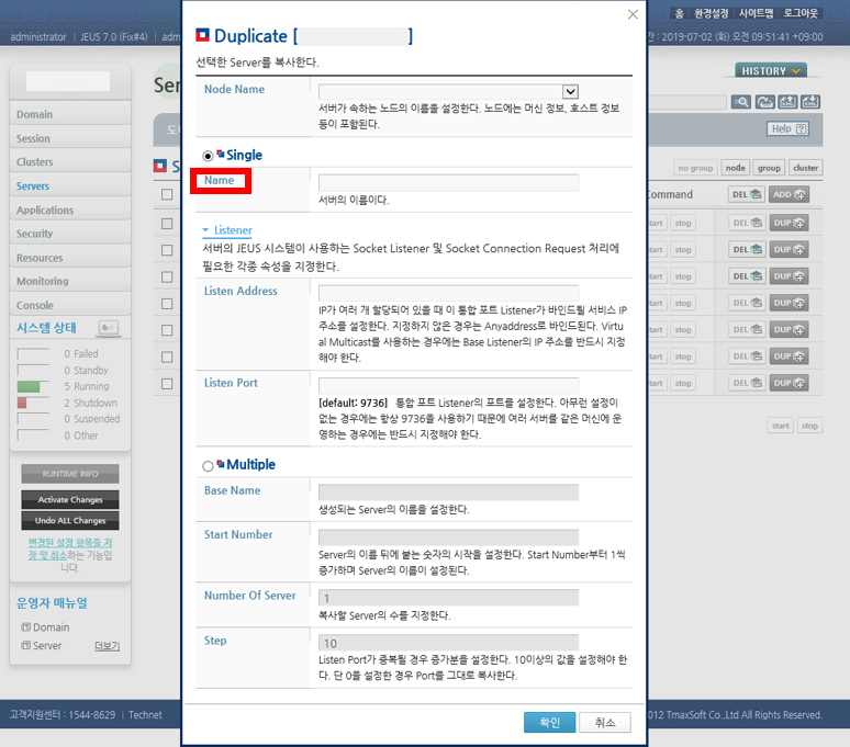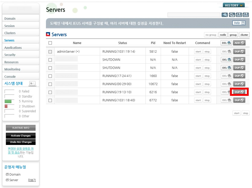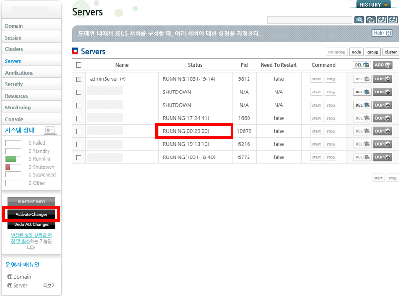 8. 수정이 완료되었다면, 왼쪽 메뉴 하단에 Activate Changes 버튼을 눌러주고, 서버를 start 해주면 서버 상태가 RUNNING으로 바뀌는 것을 볼 수 있다.