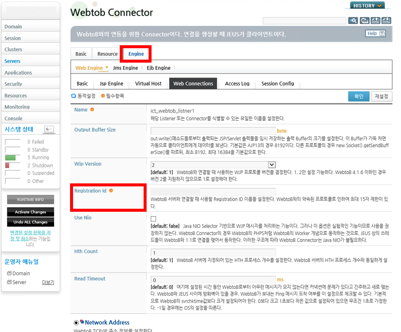 WebtoB와 연결할 Web Connection을 설정하면 되는데, 나 같은 경우는 DUP 기능으로 복제했기 때문에 따로 설정할 부분은 없고 Registration Id만 수정했다.