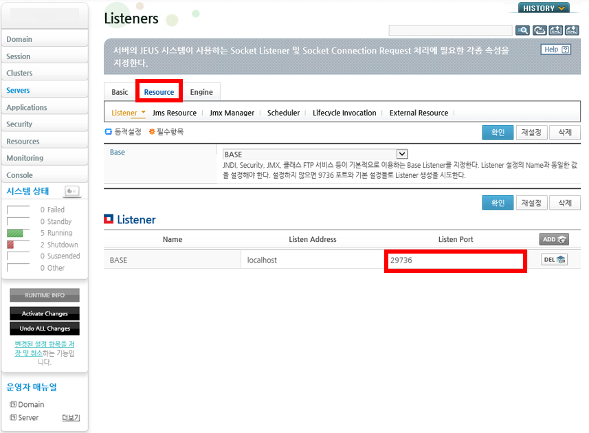 6. 추가한 서버를 클릭한 뒤 Resource 탭에 Listener의 Listen Port를 다른 서버와 겹치지 않게 변경해주어야한다.