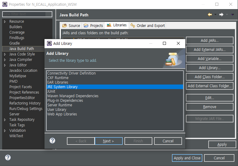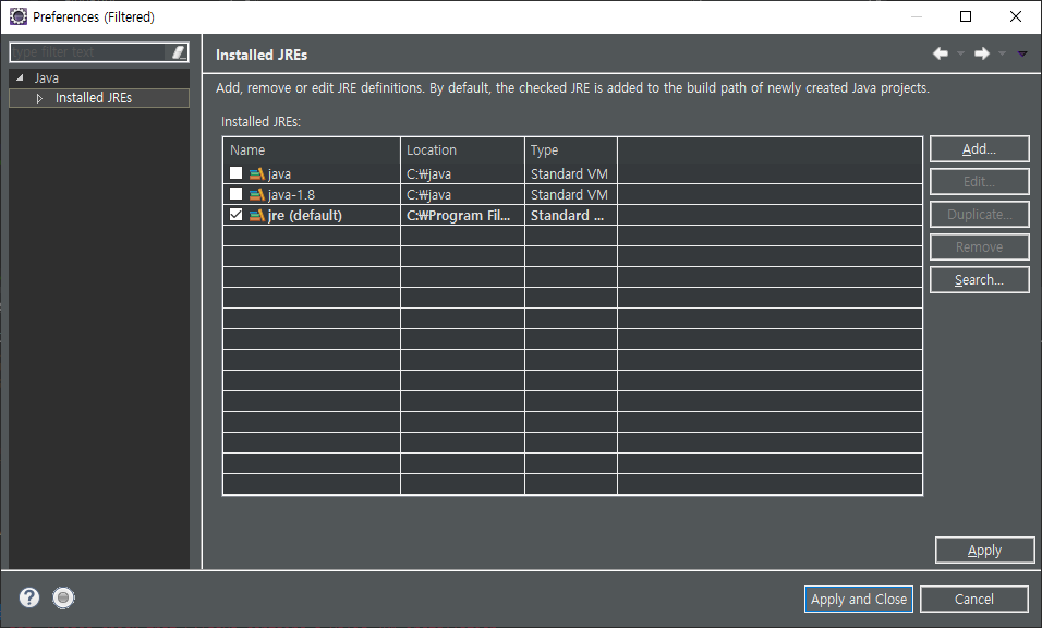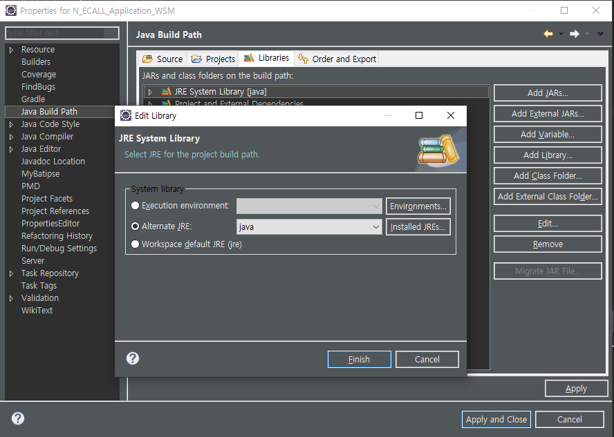 프로젝트 우클릭 Java Build Path에서 JRE System Library Edit을 누른 뒤 Alternate JRE: 체크, Installed JREs를 눌러 위에서 추가한 jre(default)를 Apply and Close 해준다.