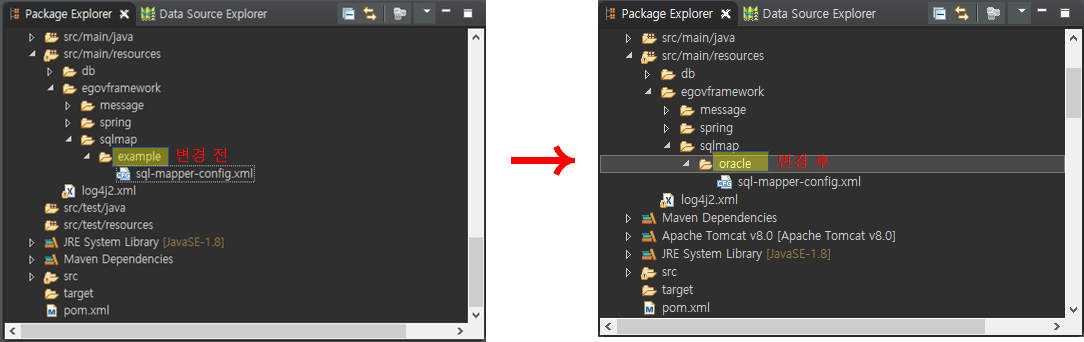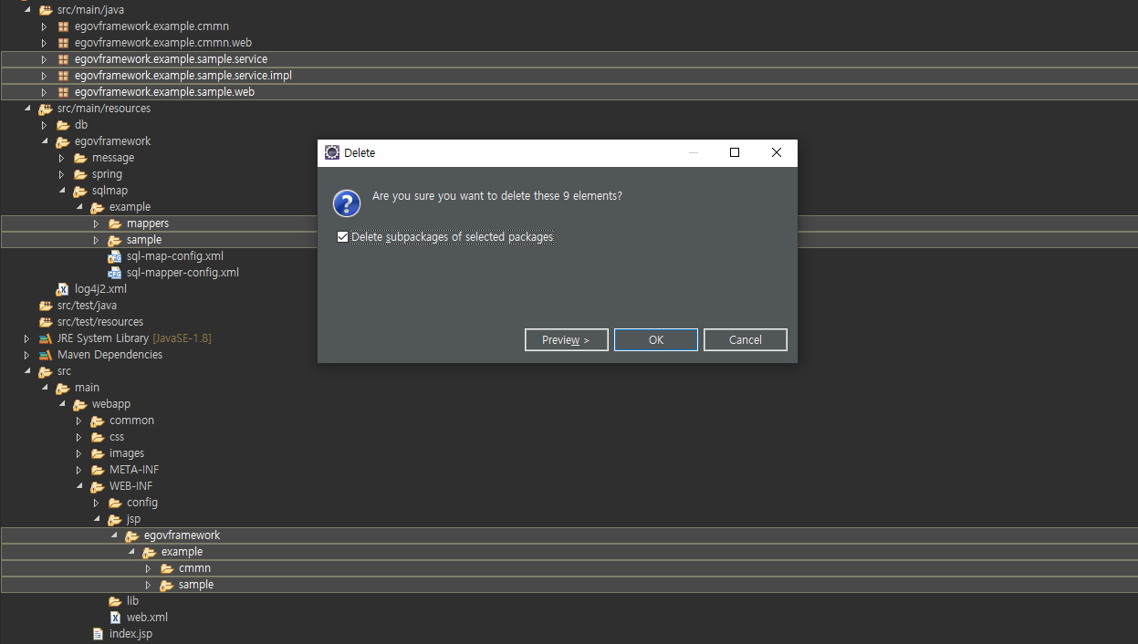 - java 소스코드가 있는 egovframework.example.sample 패키지(하위 패키지, 클래스 모두)