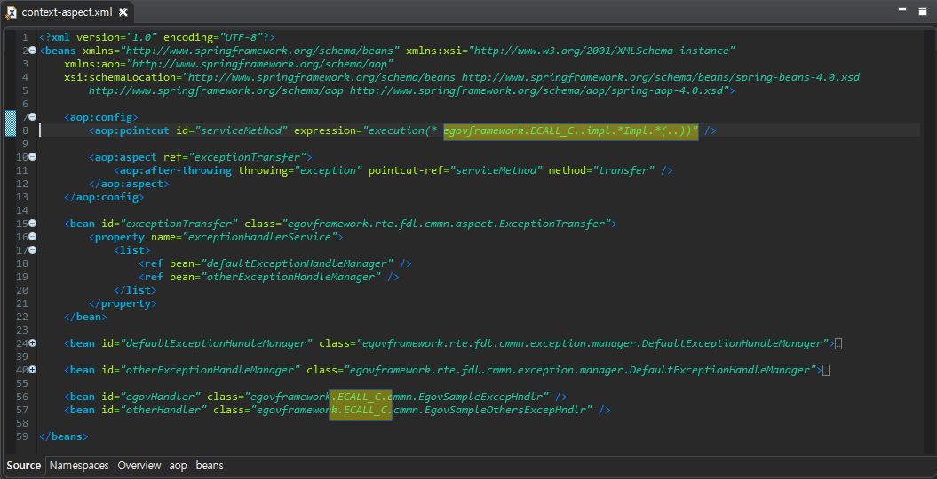 상단에 aop 태그 부분과 하단에 egovHdler, otherHandler의 경로가 example로 되어있는데 변경한 패키지명에 맞게 경로 설정 해준다.